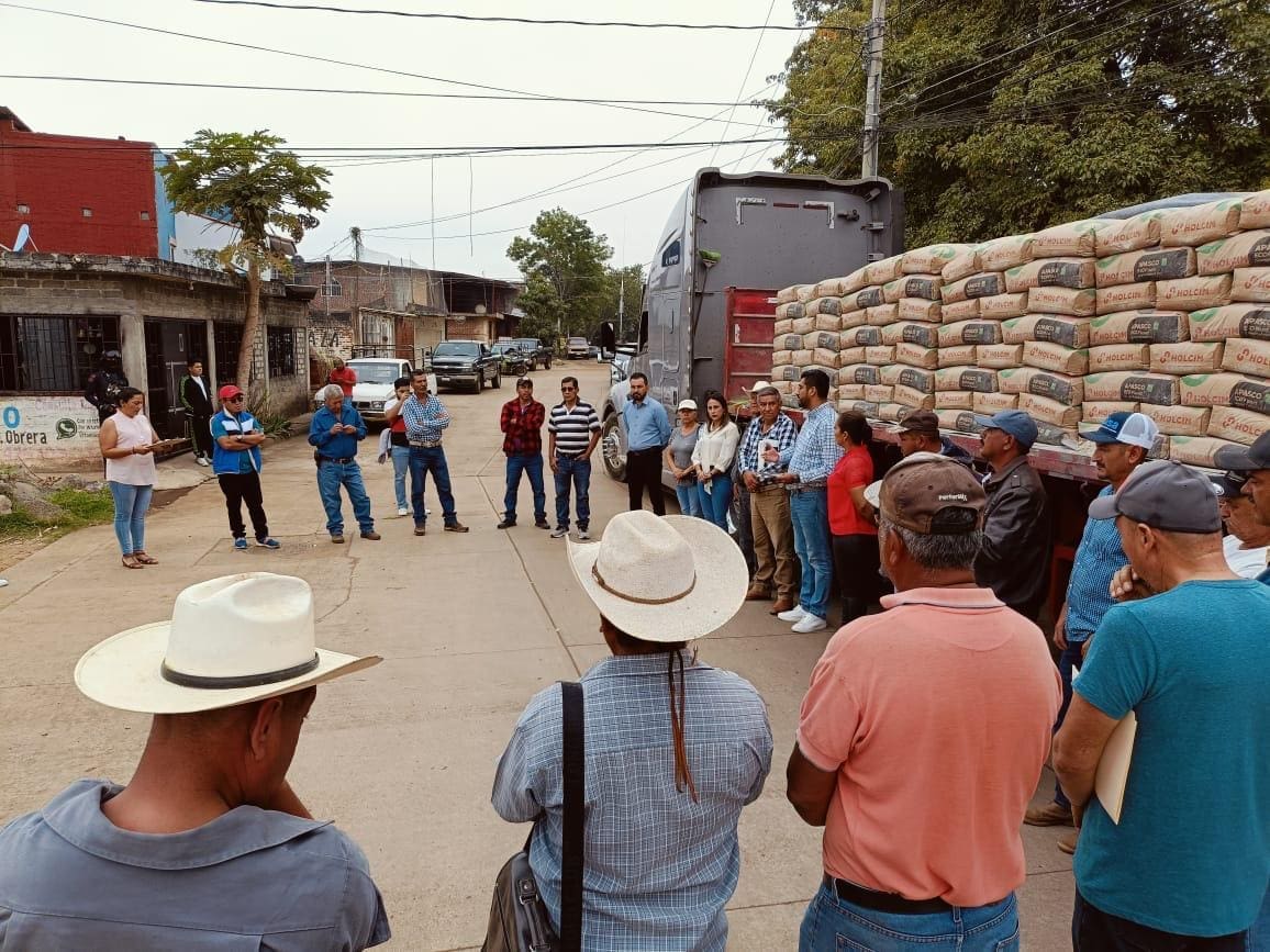 Taretan, Michoacán, 31 de enero de 2024.- Con una inversión estatal de 399 mil 059 pesos, la Secretaría de Agricultura y Desarrollo Rural (Sader) entregó 108 toneladas de cemento para el revestimiento de 2.5 km de canales de riego, en beneficio de 150 productores y 350 hectáreas de cultivos de caña de azúcar, guayaba, higo y otras frutas.