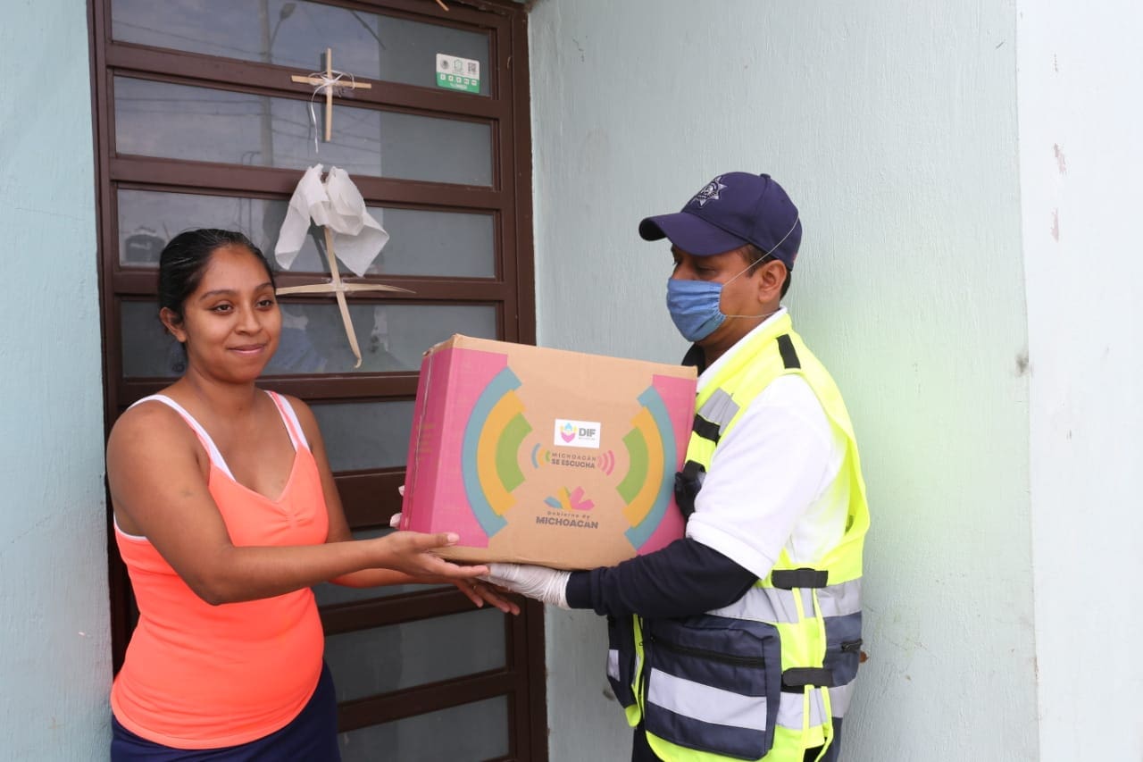 Sahuayo, Michoacán.- Esta despensa nos ayuda mucho en estos tiempos de necesidad, expresó María Isabel López Ávalos, al recibir una despensa como parte de la implementación del Plan Emergente Michoacán Alimenta.