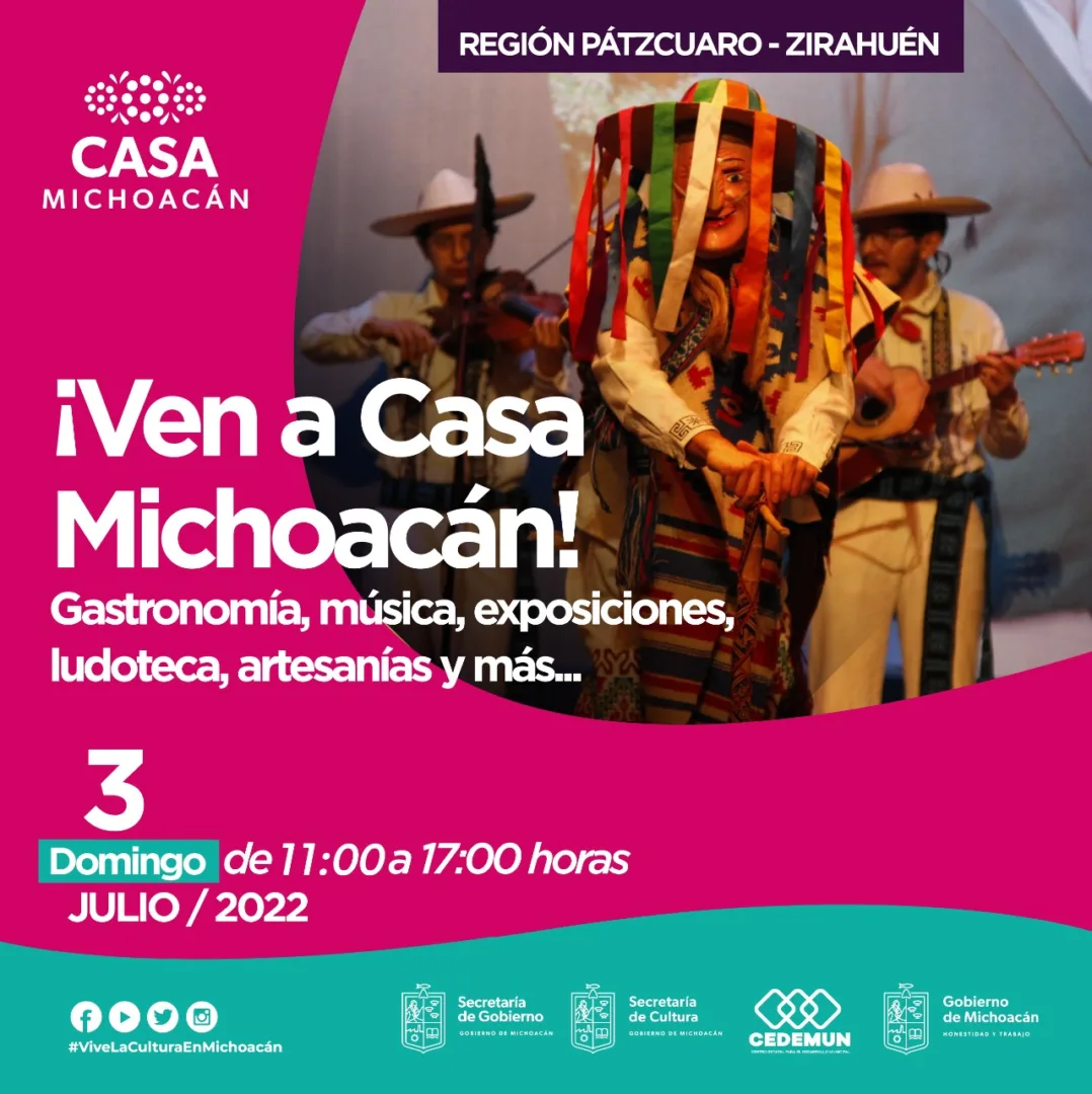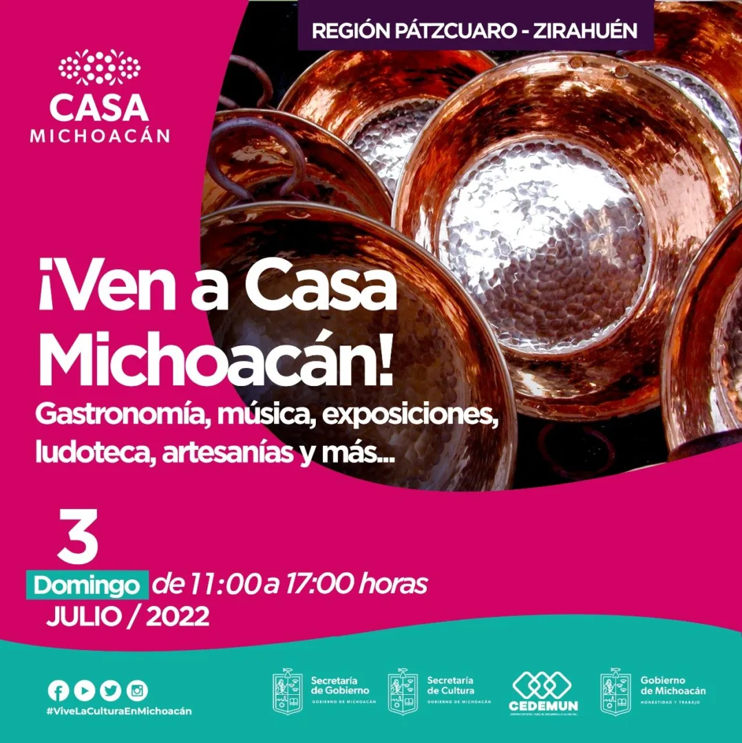 Morelia, Michoacán, 29 de junio de 2022.- La Secretaría de Cultura de Michoacán (SECUM) invita a la población en general a pasar un domingo familiar en Casa Michoacán y disfrutar de actividades artísticas y culturales, recorridos guiados, exposiciones, música, danza y gastronomía de los municipios participantes en esta ocasión de Salvador Escalante (Santa Clara del Cobre) y Erogarícuaro.