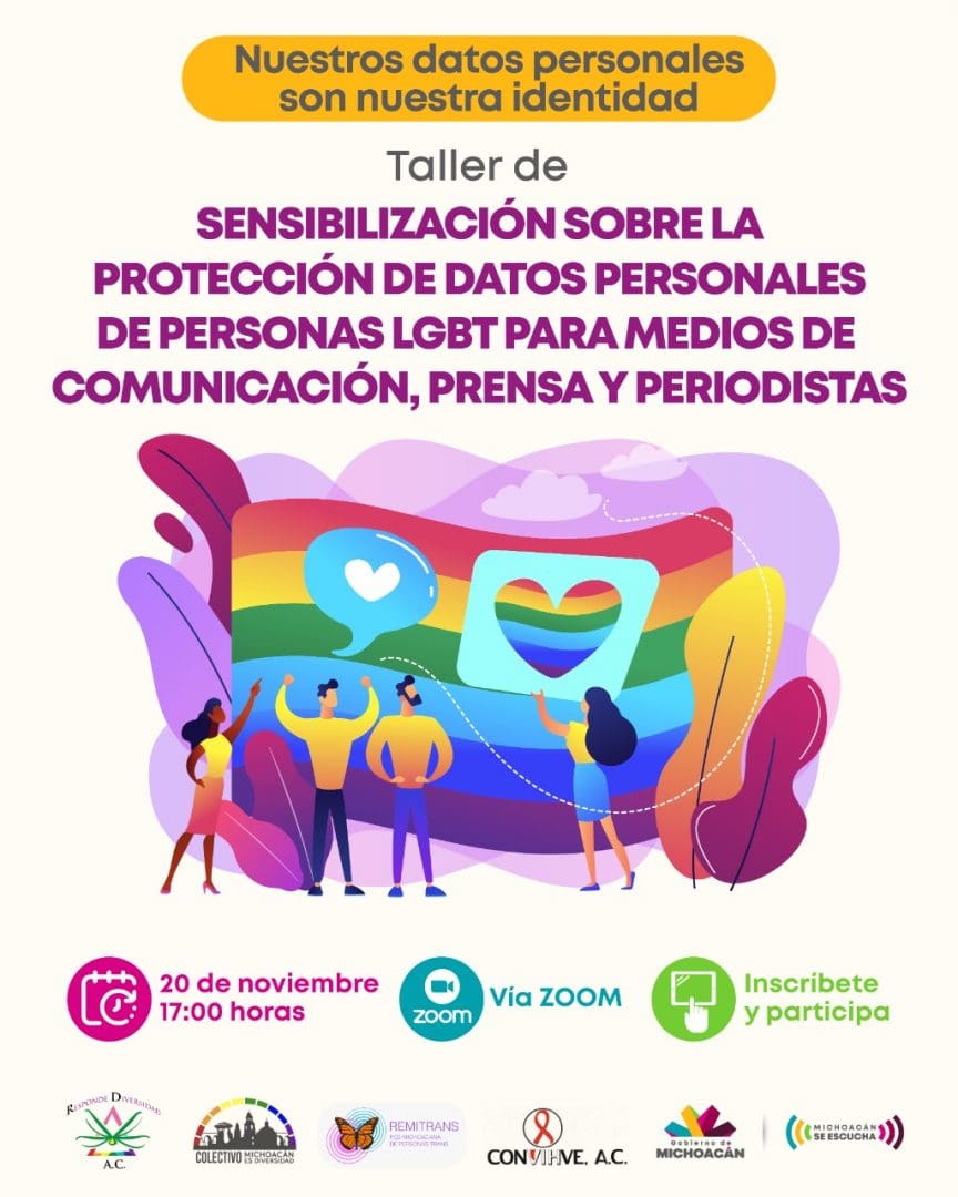 Morelia, Michoacán.- Este viernes, a las 17:00 horas, se llevará cabo el taller virtual sobre la protección de datos personales de la comunidad LGBT, mismo que está dirigido a comunicadores y periodistas.