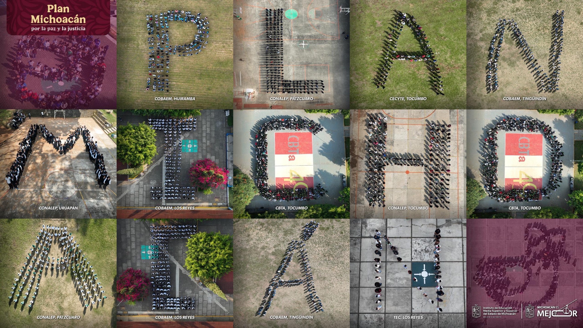 Los estudiantes, provenientes de planteles como Conalep, Cobaem, Cecytem, Telebachillerato, institutos tecnológicos y universidades públicas, realizaron actividades comunitarias y formaron la frase “Plan Michoacán” como contribución al Mosaico Nacional, informó el instituto. El Iemsysem indicó que esta expresión simbolizó la participación activa de los jóvenes en la construcción de comunidades libres de adicciones y un futuro en paz.