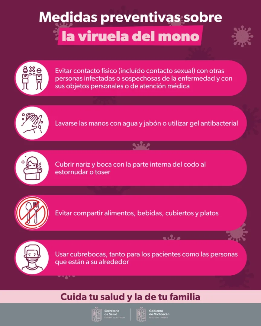 Hasta el momento, Michoacán se mantiene libre de casos de viruela símica; sin embargo, la SSM mantiene vigilancia epidemiológica en todo el estado y refuerza las medidas sanitarias básicas que también protegen contra Covid-19.