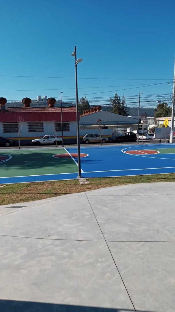 La intervención de la cancha de básquetbol se realizó en una superficie de 350 metros cuadrados de concreto, con su respectiva pintura y balizamiento, además se construyó la estructura de un área de circulación peatonal a base de lámina microperforada de acero acabado tipo óxido, para salvaguardar la integridad de los usuarios.