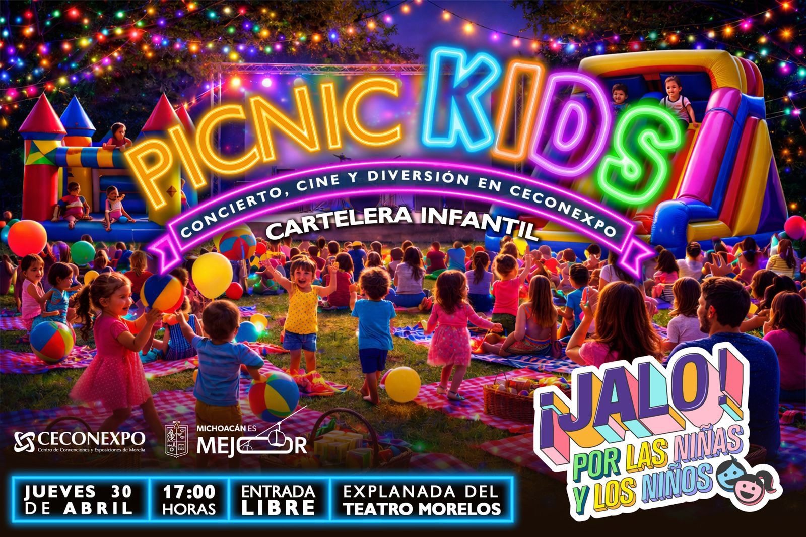 El Gobierno del Estado anunció la realización del festival “Picnic Kids” como parte de la estrategia “Jalo por las Niñas y los Niños”, el cual se llevará a cabo este jueves 30 de abril en la Explanada del Teatro Morelos del Centro de Convenciones y Exposiciones de Morelia (Ceconexpo). Las actividades programadas iniciarán a partir de las 17:00 horas con acceso gratuito para el público.