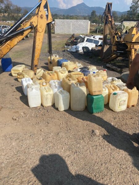 Como resultado de las acciones coordinadas entre la Secretaría de Seguridad y Protección Ciudadana (SSPC), el Ejército Mexicano, la Guardia Nacional, la Secretaría de Marina – Armada de México, la Secretaría de Seguridad Pública Estatal y otras corporaciones, se llevó a cabo la destrucción de 385 contenedores, bidones, tambos, recipientes y mangueras.