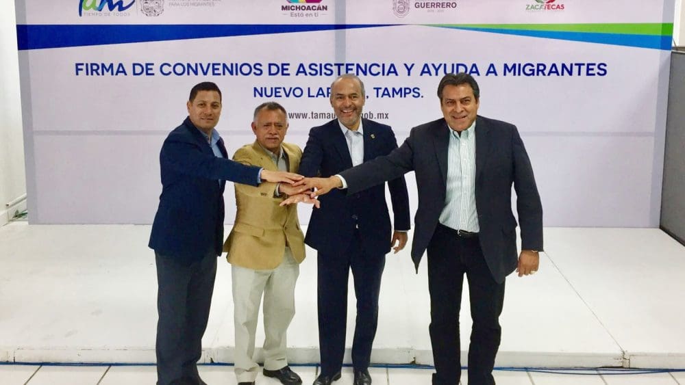 Lo anterior, gracias al convenio de colaboración signado por el titular de la Secretaría del Migrante (Semigrante), José Luis Gutiérrez; el director del Instituto Tamaulipeco para los Migrantes, José Martín Carmona Flores; además de José Juan Estrada y Fabián Morales, representantes de las Oficinas Estatales de Atención al Migrante de Zacatecas y Guerrero, respectivamente.