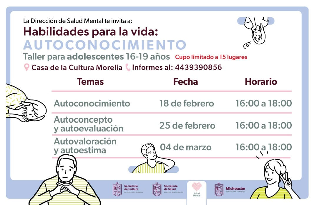 Morelia, Michoacán, 14 de febrero del 2023.- La Secretaría de Salud de Michoacán (SSM), a través de la Dirección de Salud Mental, invita a los jóvenes de entre 12 y 19 años, padres de familia y tutores, a participar en los talleres gratuitos de habilidades para la vida y prevención del suicidio, que se realizarán del 19 de febrero al 5 de marzo en la Casa de la Cultura de Morelia.