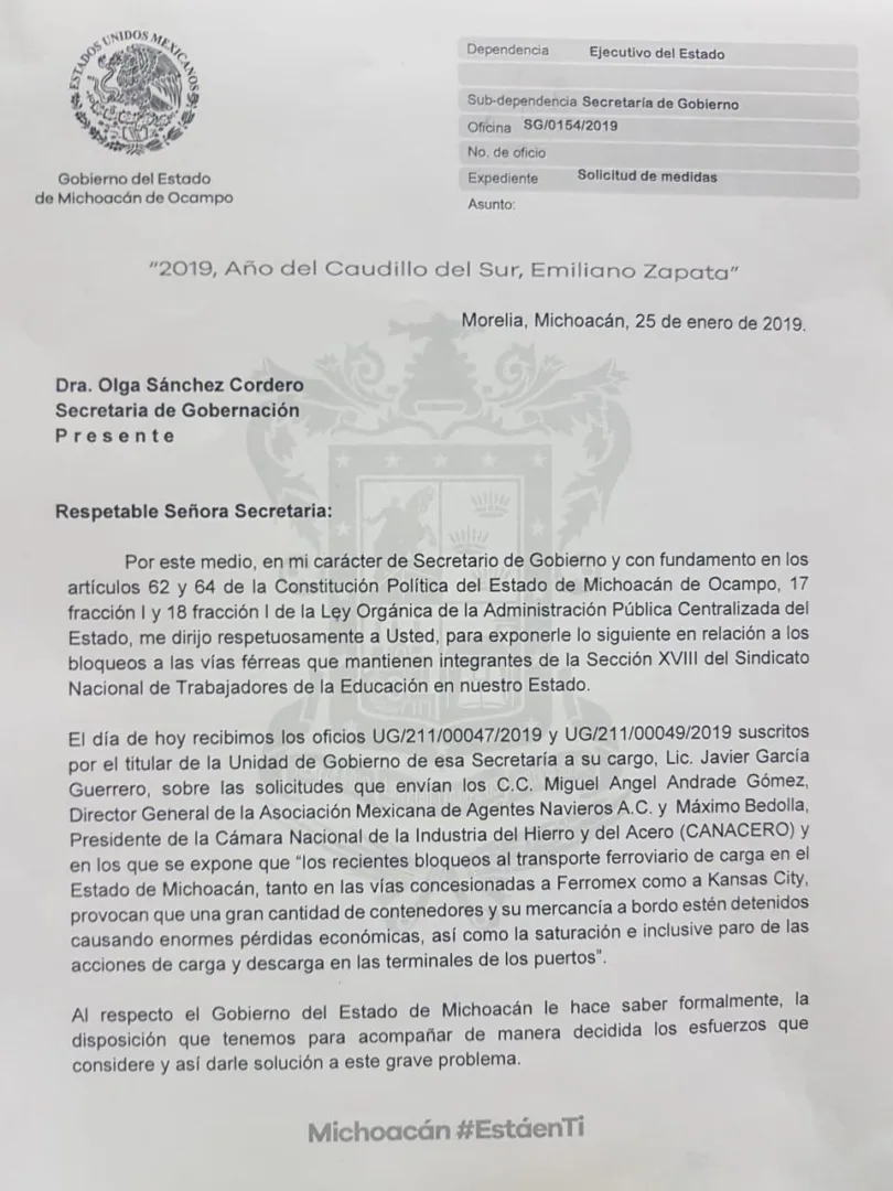 Morelia, Michoacán.- El Gobierno de Michoacán solicitó de manera formal al Gobierno de la República la liberación de las vías férreas, las cuales cumplen hoy 12 días obstruidas por el magisterio provocando severas afectaciones económicas y a la vida de las michoacanas y los michoacanos.