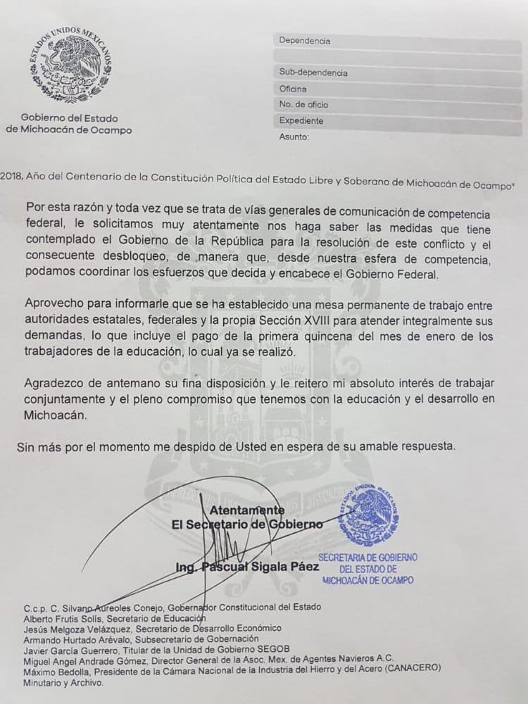 De igual manera, el Ejecutivo de Michoacán solicita, formalmente se conozcan las medidas tomadas por el Gobierno de la República para resolver el bloqueo de las vías federales de comunicación y con ello poder respaldar las acciones que dicha instancia emprenda.