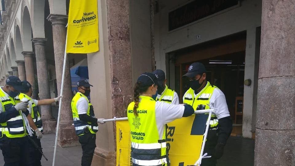 Sahuayo, Michoacán- La Secretaría de Seguridad Pública (SSP), fortalece los trabajos preventivos de combate al COVID-19, a través de la instalación de Banderas Amarillas y emitiendo recomendaciones sanitarias para que la población conozca que el riesgo de contagio del virus es alto.