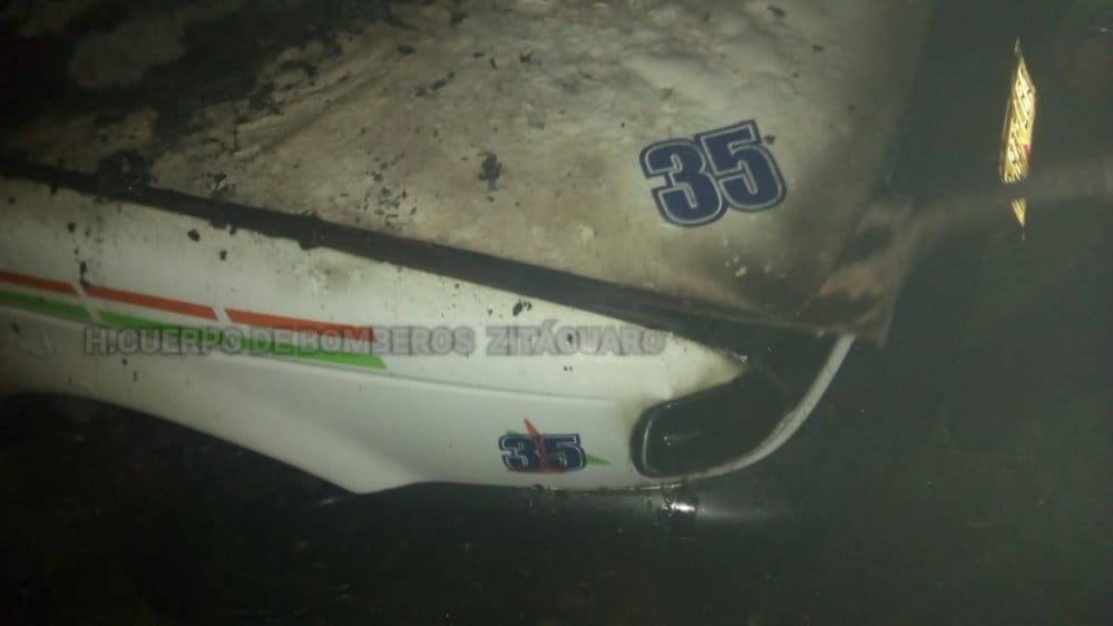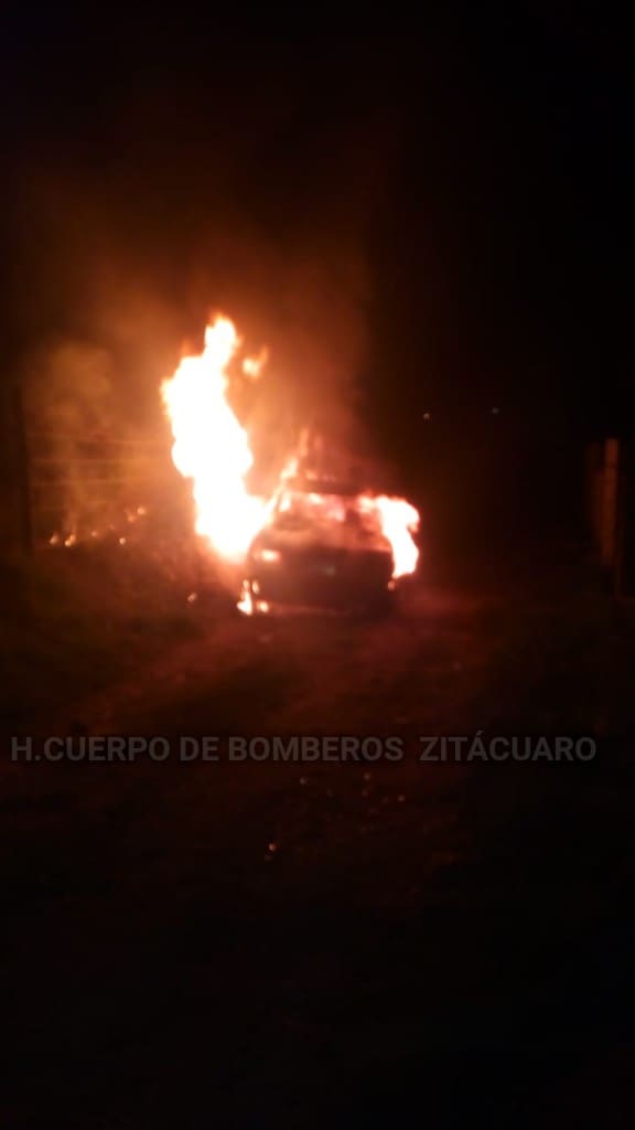 Zitácuaro Michoacán. Bomberos reportó que en la tenencia de San Miguel Chichimequillas se incendió un vehículo Nissan tipo Tsuru del servicio público de la línea Mega Plus, con número económico 35.