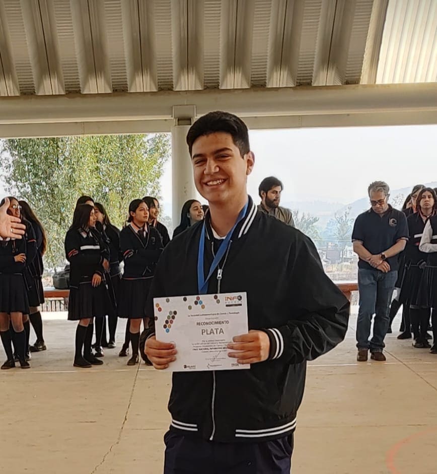 Morelia, Michoacán, 23 de mayo de 2023.- Con una presea de plata, Martín Rojas, alumno del plantel Irapeo del Colegio de Estudios Científicos y Tecnológicos del Estado de Michoacán (Cecytem), se subió al pódium en el Concurso Nacional de Ciencia Infomatrix México 2023, celebrado en Jalisco.