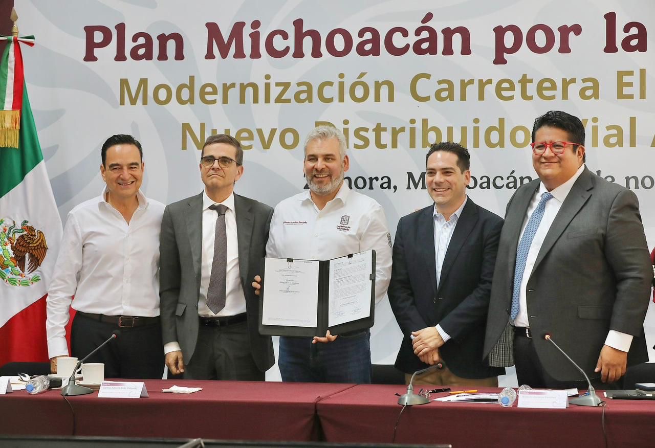 El mandatario firmó un nuevo título de concesión con Gonzalo Alcalde Rodríguez, director de la empresa Red Carreteras de Occidente (RCO), para la renovación de 3.6 kilómetros de la carretera El Sauz-La Rinconada y la construcción del distribuidor vial. Las obras beneficiarán a los habitantes de Zamora, Ecuandureo, Jacona e Ixtlán.
