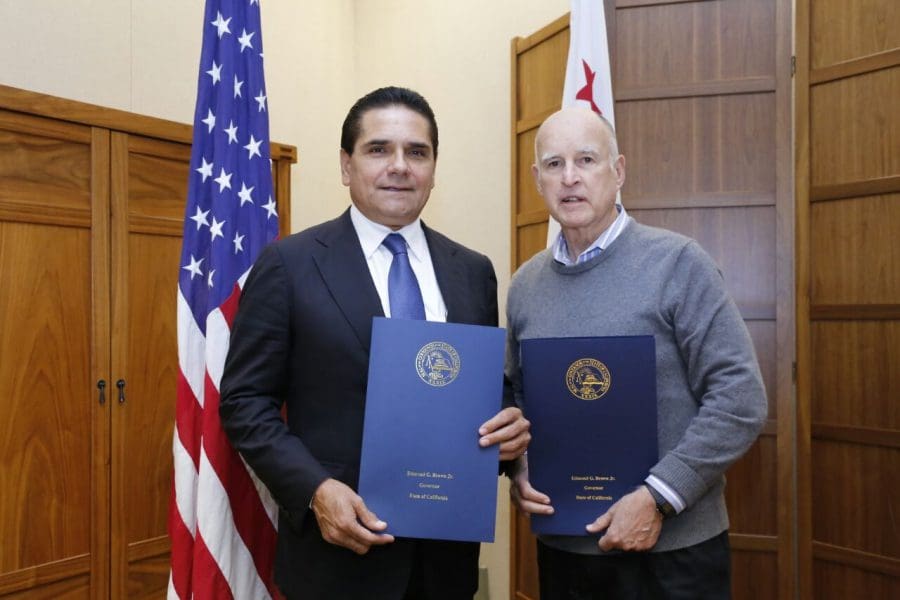 Sacramento, California, a 14 de febrero de 2017.- El Gobernador de Michoacán, Silvano Aureoles Conejo, sostuvo este martes una reunión de trabajo con el Gobernador de California, Jerry Brown, con quien acordó establecer mecanismos de comunicación y cooperación para defender los derechos de las y los migrantes que radican en Estados Unidos.