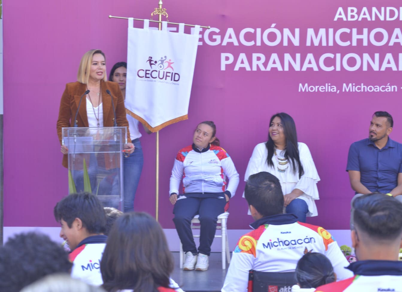 Morelia, Michoacán, 5 de noviembre del 2022.- El Gobierno de Michoacán refrenda su apoyo a los deportistas de la entidad con alguna discapacidad, al dar a conocer que se becará a los jóvenes que logren una medalla en los Juegos Paranacionales Conade 2022, mismos que hoy fueron abanderados.