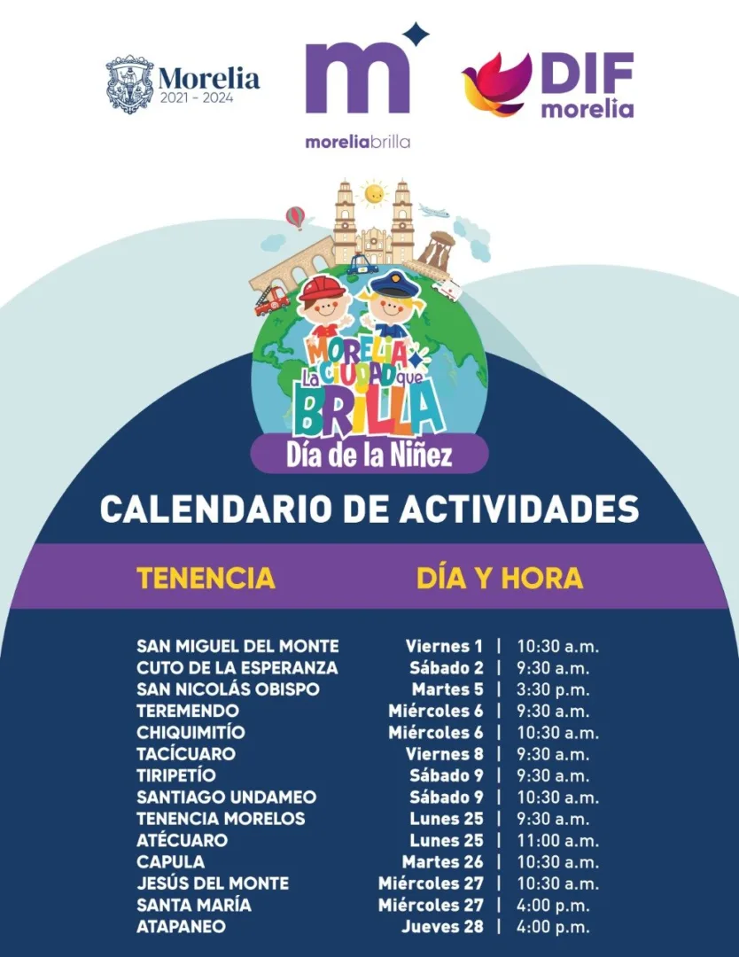 El programa completo será publicado en las redes sociales del Gobierno Municipal y del DIF de Morelia; todos los eventos serán públicos y estarán dirigidos a niñas y niños de 2 a 12 años.
