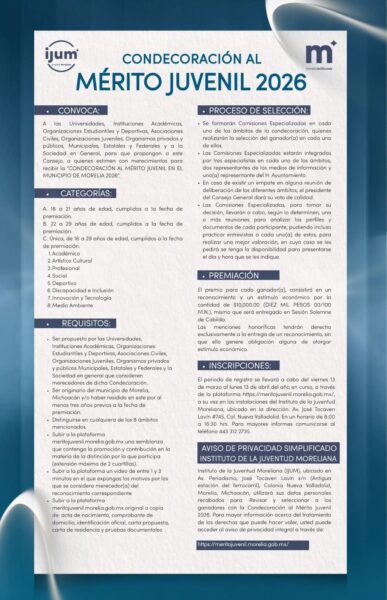 La dependencia puso a disposición de la ciudadanía el sitio web oficial https://meritojuvenil.morelia.gob.mx/ para la consulta de las bases íntegras y el registro de los expedientes.