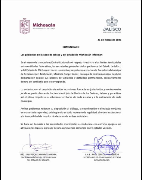 Morelia, Michoacán, 21 de marzo de 2026.- Los gobiernos de Michoacán y Jalisco emitieron un comunicado conjunto en el que exhortan de manera respetuosa a la presidenta municipal de Tepalcatepec, **Maricela Rangel López**, para que la policía municipal cumpla estrictamente con las disposiciones legales y restrinja sus labores de vigilancia y seguridad al ámbito territorial de su jurisdicción.