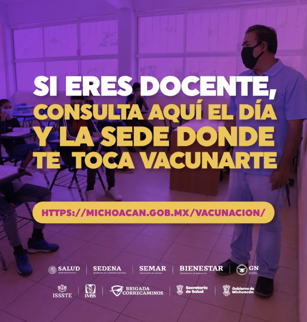 Por lo anterior, las y los docentes pueden ingresar a https://michoacan.gob.mx/vacunacion/ para realizar el proceso que les permita recibir la vacuna a partir de este martes 4 de mayo en alguno de los 10 municipios sede en la entidad.