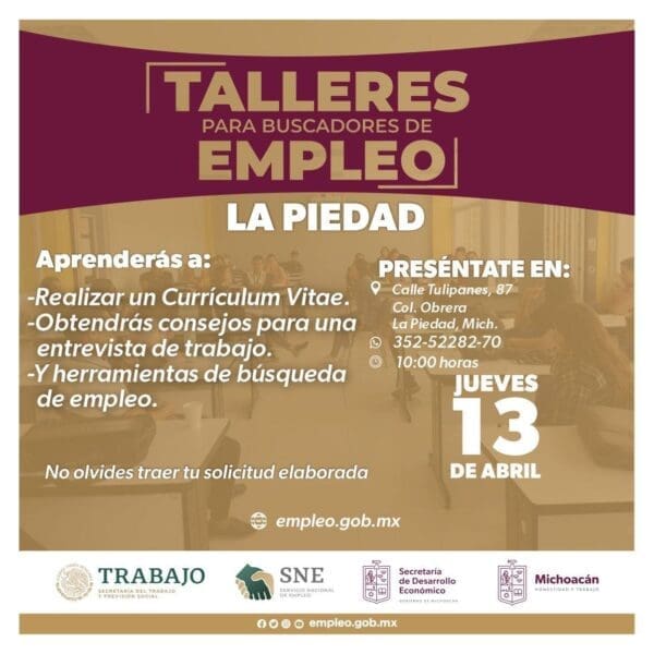 El jueves 13 de abril se llevará a cabo Taller para Buscadores de Empleo en Morelia, a las 10:00 horas, en avenida Lázaro Cárdenas 866, colonia Ventura Puente; información vía WhatsApp en el número 4431 009526. El mismo día, pero en La Piedad, se ofrecerá de manera presencial, a las 10:00 horas, en calle Tulipanes número 87, colonia Obrera; para mayor información en el número 353 52282 70.