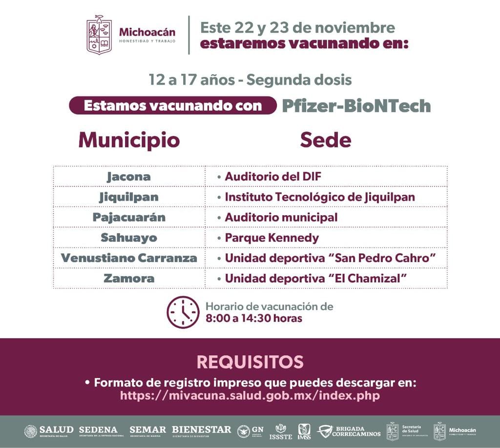 Morelia, Michoacán, 21 de noviembre del 2022.- Hoy lunes y hasta el 25 de noviembre se estará inmunizando contra el COVID-19 a jóvenes de 12 a 17 años con y sin comorbilidad con primeras, segundas dosis y refuerzos en 46 municipios y localidades de la entidad.