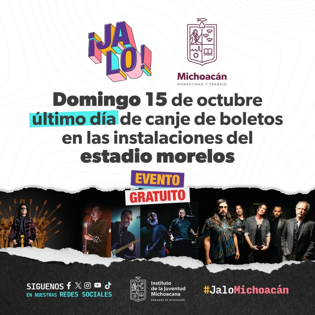 Morelia, Michoacán, 15 de octubre de 2023.- Hoy domingo es el último día para la adquisición de tus boletos para los conciertos del festival Jalo, que incluyen la presentación de El Tri, Molotov, Caifanes y la presentación de 13 bandas locales, este 20, 21 y 22 de octubre en el estadio Morelos, que organiza el Gobierno del Estado.