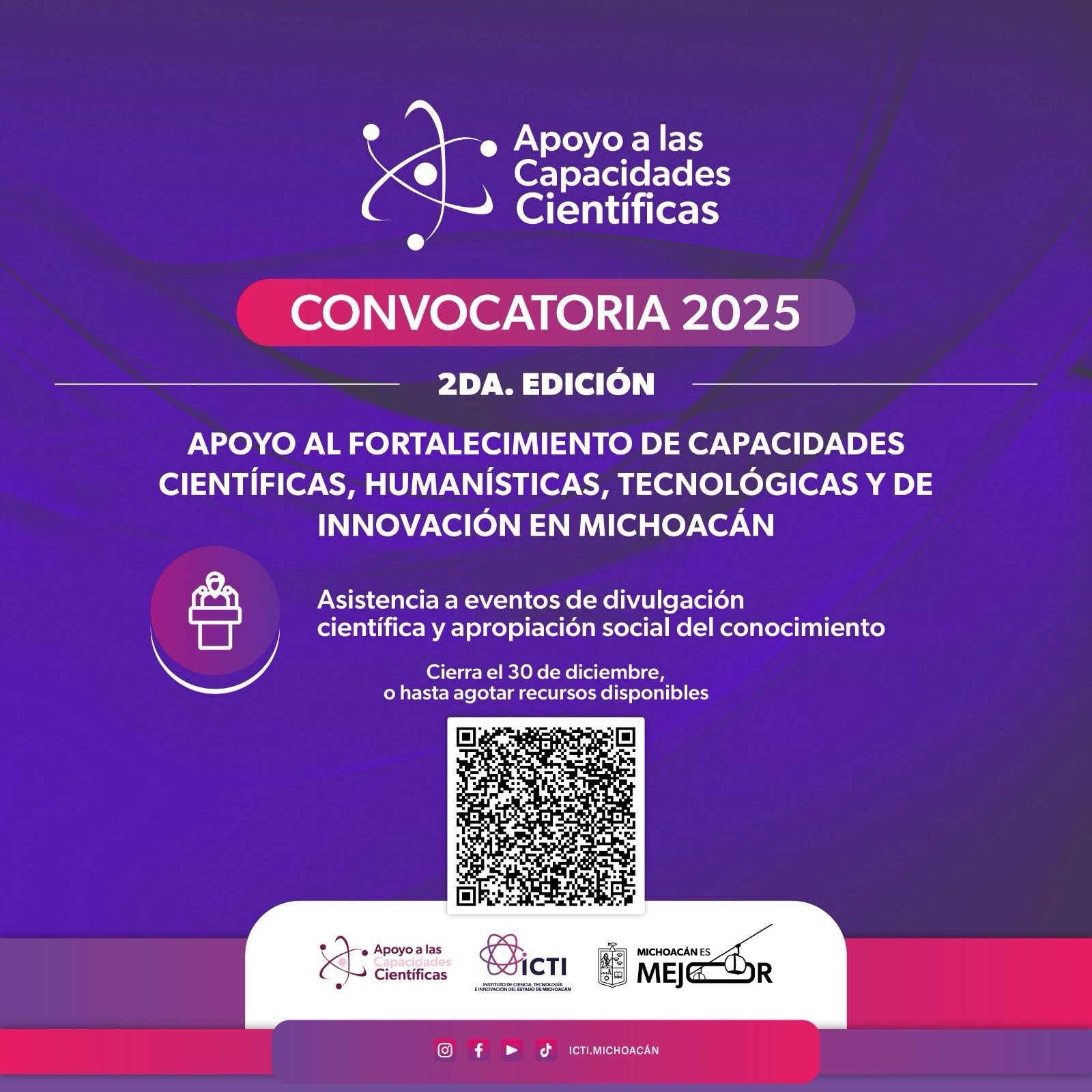 El Instituto de Ciencia, Tecnología e Innovación (ICTI) de Michoacán informó sobre la apertura de la segunda edición 2025 de la convocatoria “Apoyo para el Fortalecimiento de las Capacidades Científicas, Humanísticas, Tecnológicas y de Innovación”.