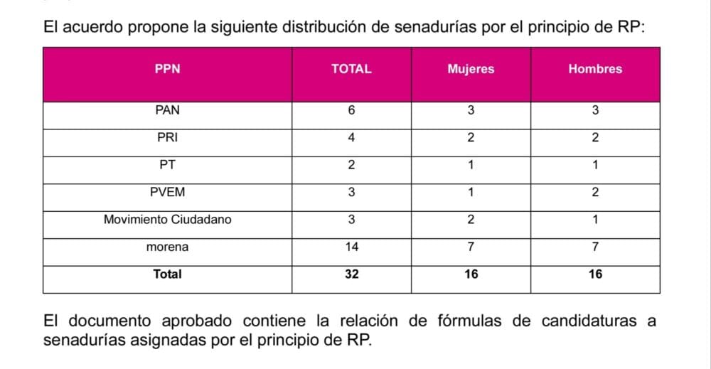 El documento aprobado establece la asignación de 200 diputaciones y 32 senadurías por el principio de representación proporcional a los partidos políticos nacionales.