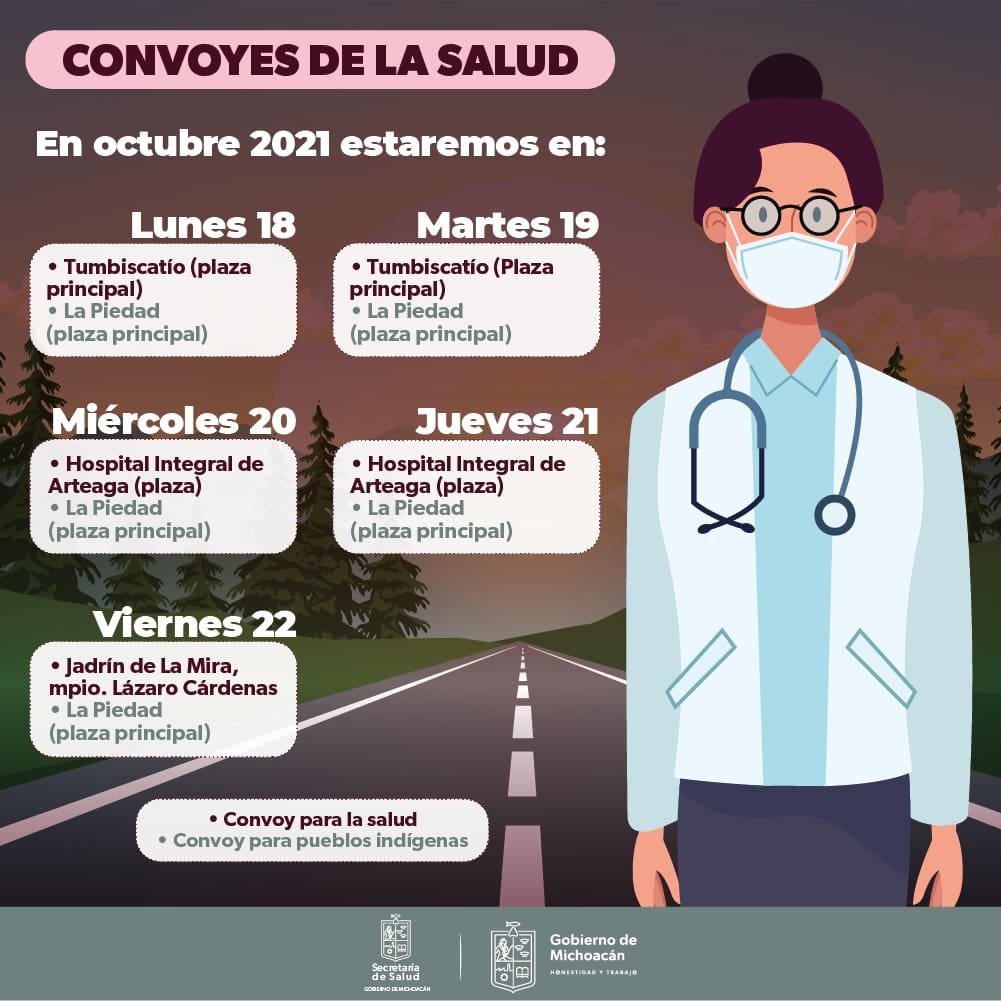 El convoy para la salud se encontrará en la plaza principal de Tumbiscatío (18-19), Hospital Integral de Arteaga (20-21) y en el jardín de La Mira, municipio de Lázaro Cárdenas (22).