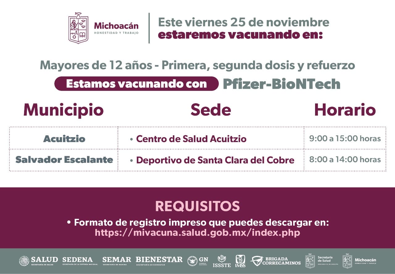Asimismo, se les aplicarán primeras y segundas dosis, para lo cual el día 23 de noviembre se instalarán dos sedes para la inmunización en la Escuela Maestro Justo Sierra de Ario y el Auditorio Municipal de Villa Jiménez