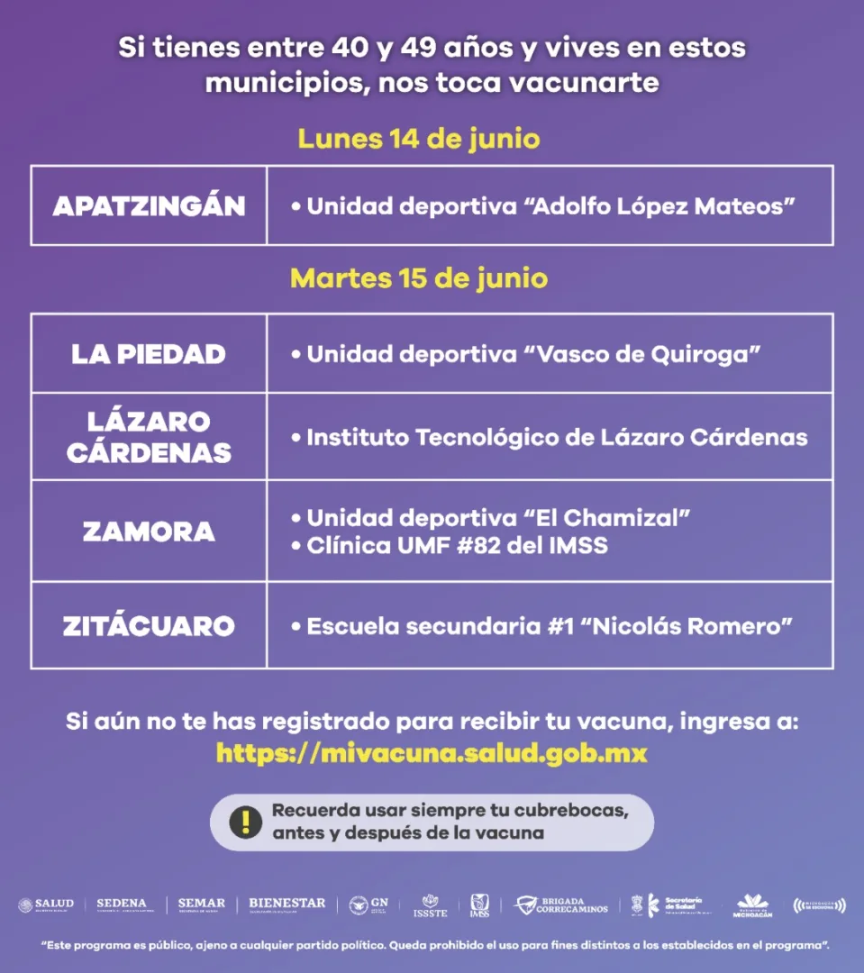 Morelia, Michoacán, a 13 de junio de 2021.- El Consejo Estatal de Vacunación (COEVA), informa que a partir de este lunes inicia la inmunización a las y los michoacanos de 40 a 49 años en Apatzingán; mientras que en Zamora, Zitácuaro, La Piedad y Lázaro Cárdenas a partir del martes.