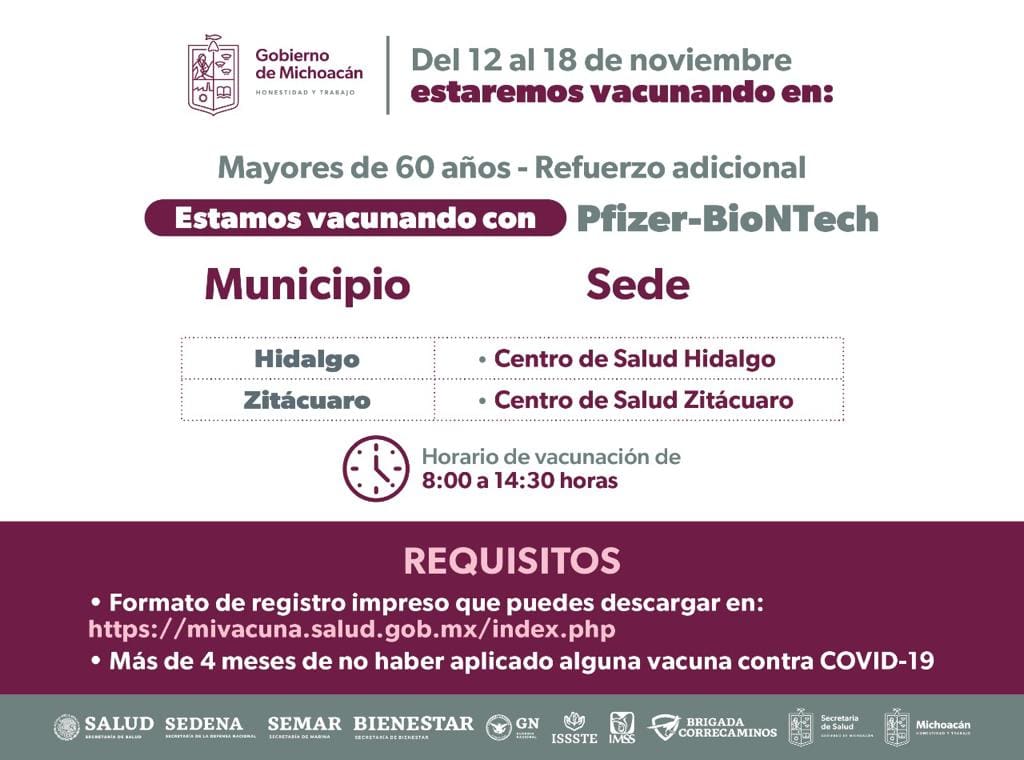 Morelia, Michoacán, 13 de noviembre del 2022.- El Gobierno de Michoacán puso en marcha la aplicación del refuerzo contra el COVID-19 para las personas de 60 años y más; es así que todos los adultos mayores, que requieran de ésta dosis adicional, la podrán solicitar durante el mes de noviembre.