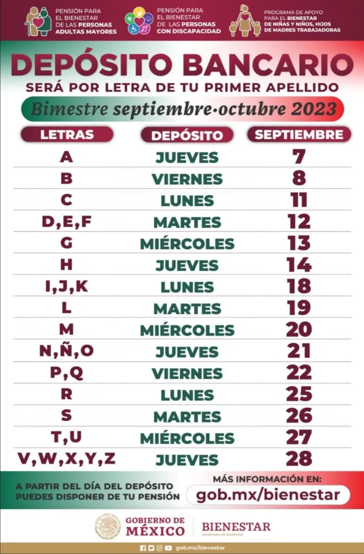 Añadió que, para brindar mejor atención a derechohabientes, el depósito bancario se realizará de acuerdo con la letra del primer apellido, por lo que no es necesario acudir antes de la fecha programada, ya que el recurso estará disponible a partir del día señalado en el siguiente calendario: