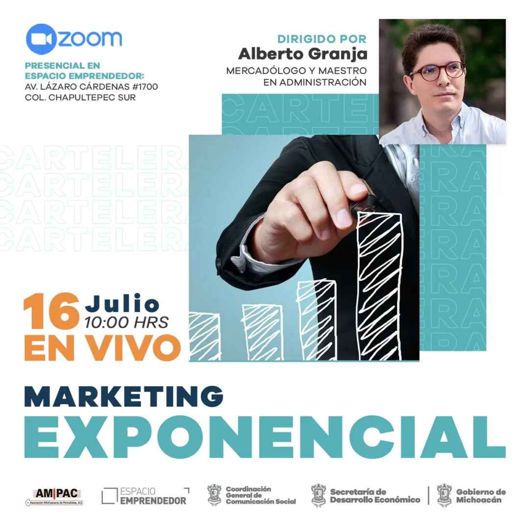 Morelia, Michoacán, a 14 de julio de 2021.- Con el curso sobre ·Marketing Exponencial·, que será ofrecido por el mercadólogo Alberto Granja, iniciarán los talleres “Emprendedores del Periodismo”, organizados por el Gobierno de Michoacán a través de la Secretaría de Desarrollo Económico (Sedeco) y la Coordinación General de Comunicación Social.