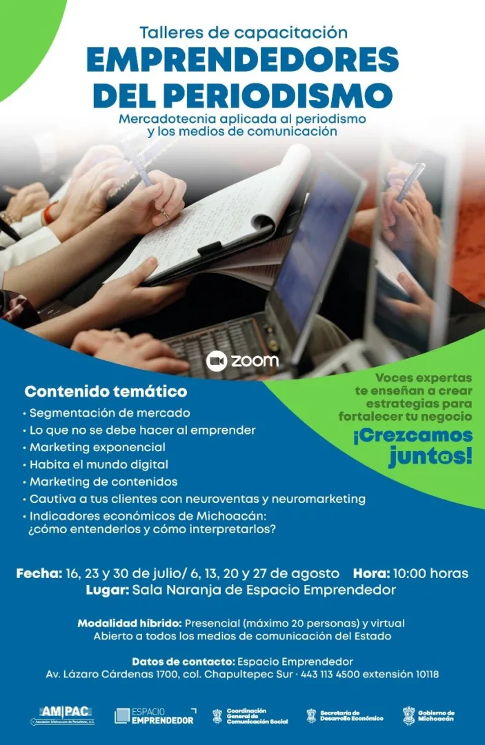 Bajo la efectiva coordinación y despliegue logístico de Espacio Emprendedor, uno de los programas sello de la administración del Gobernador Silvano Aureoles Conejo, es que se ofrecerán estas alternativas de capacitación en mercadotecnia aplicada al periodismo y los medios de comunicación.