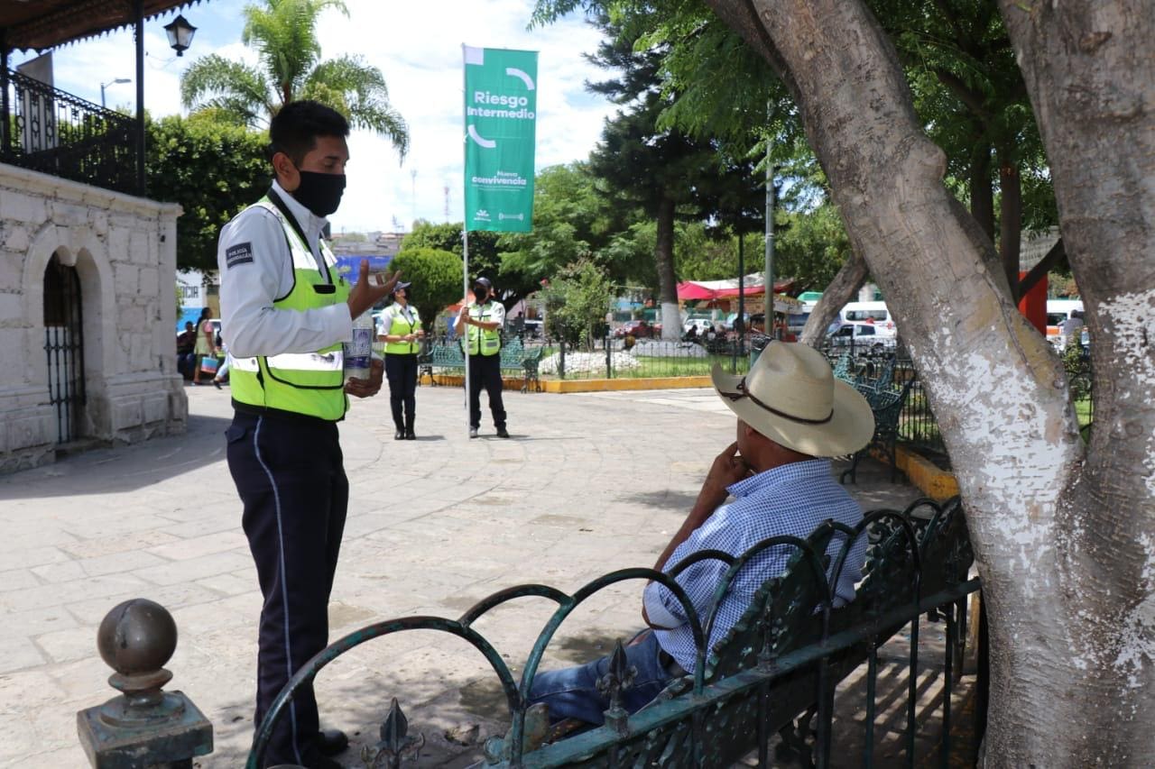 Oficiales de la Policía Michoacán, colocaron Bandera Verde sobre uno de los accesos a la cabecera municipal y en la plaza principal, lugares donde orientaron a la población sobre las medidas que se deben aplicar para evitar el incremento de nuevos contagios en esta pandemia.