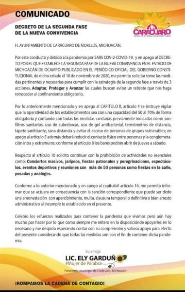 Carácuaro Michoacán. A través de un comunicado oficial, la presidenta municipal de Carácuaro Elisenda Garduño Garduño informó que continuarán con la prohibición de actividades no esenciales como: Conciertos masivos, jaripeos, fiestas patronales y peregrinaciones, espectáculos, eventos deportivos y reuniones con más de 50 personas como fiestas en la calle, posadas , etc.