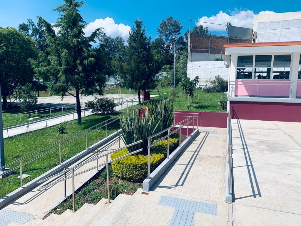 Lo anterior, se logró gracias al programa social denominado Realidades que permitió la instalación de cuatro rampas de acceso con pasamanos desde la entrada del plantel, cuatro cajones de estacionamiento especiales para personas con discapacidad, nueve guías táctiles para invidentes, barda perimetral, plaza cívica, pórtico de acceso y andadores.