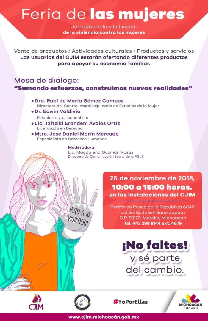 Morelia, Michoacán.- En el marco de la Conmemoración del día Internacional para la Eliminación de la Violencia contra las Mujeres -25 de noviembre- y como parte de las acciones que se llevan a cabo para reconocer el papel de la mujer, así como su derecho a una vida libre de violencia y acceso a la justicia, la Procuraduría General de Justicia del Estado (PGJE) a través del Centro de Justicia Integral para Mujeres (CJIM) llevará a cabo “La Feria de las Mujeres”.
