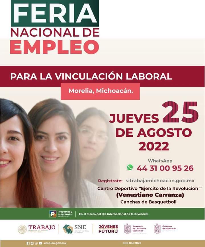Morelia, Michoacán, 10 de agosto del 2022.- Con el compromiso de promover la incorporación de los programas federales y seguir generando las condiciones para la construcción de un entorno seguro con igualdad de oportunidades de desarrollo para todas y todos, se realizará la “Feria Nacional de Empleo para la Inclusión Laboral de la Juventud 2022”.
