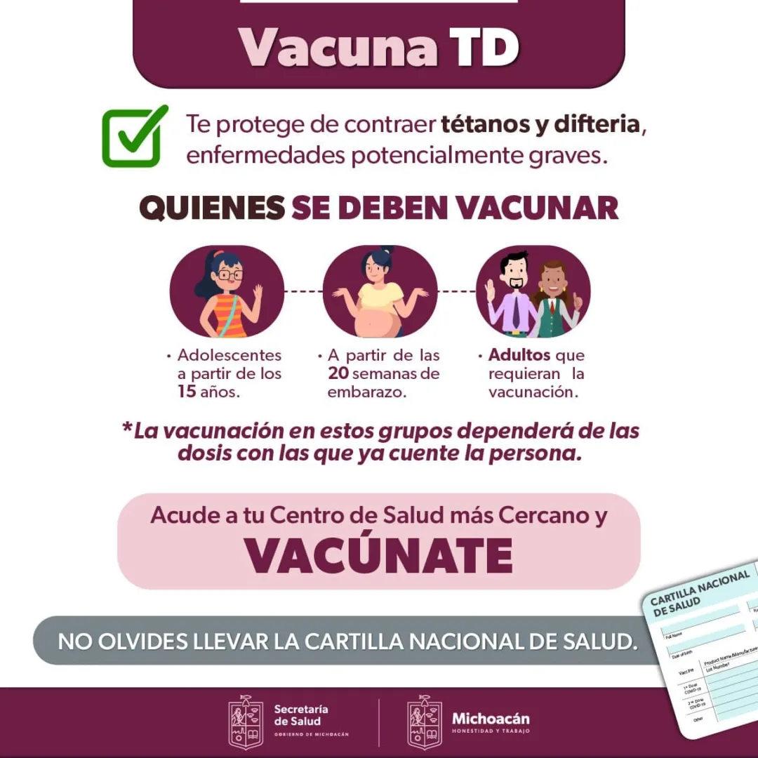 Morelia, Michoacán, 17 de enero de 2023.- Para proteger a las futuras madres contra enfermedades infecciosas como la difteria, tosferina y tétanos, la Secretaría de Salud de Michoacán (SSM) invita a las mujeres embarazadas a vacunarse contra el tétanos neonatal, entre el segundo y tercer semestre de la gestación, en el centro de salud más cercano.