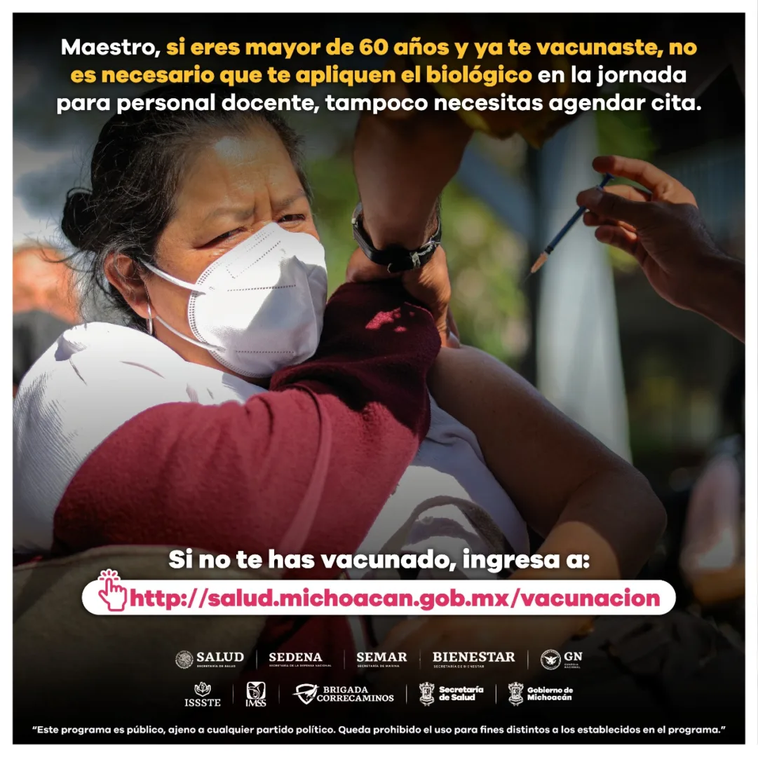 Morelia, Michoacán, a 2 de mayo de 2021.- La Secretaría de Salud de Michoacán (SSM), informa a los docentes mayores de 60 de años que ya se vacunaron que no es necesario aplicarse nuevamente el biológico contra el COVID-19 durante la jornada de inmunización de las y los maestros en Michoacán, por lo que tampoco es necesario que agenden una cita.