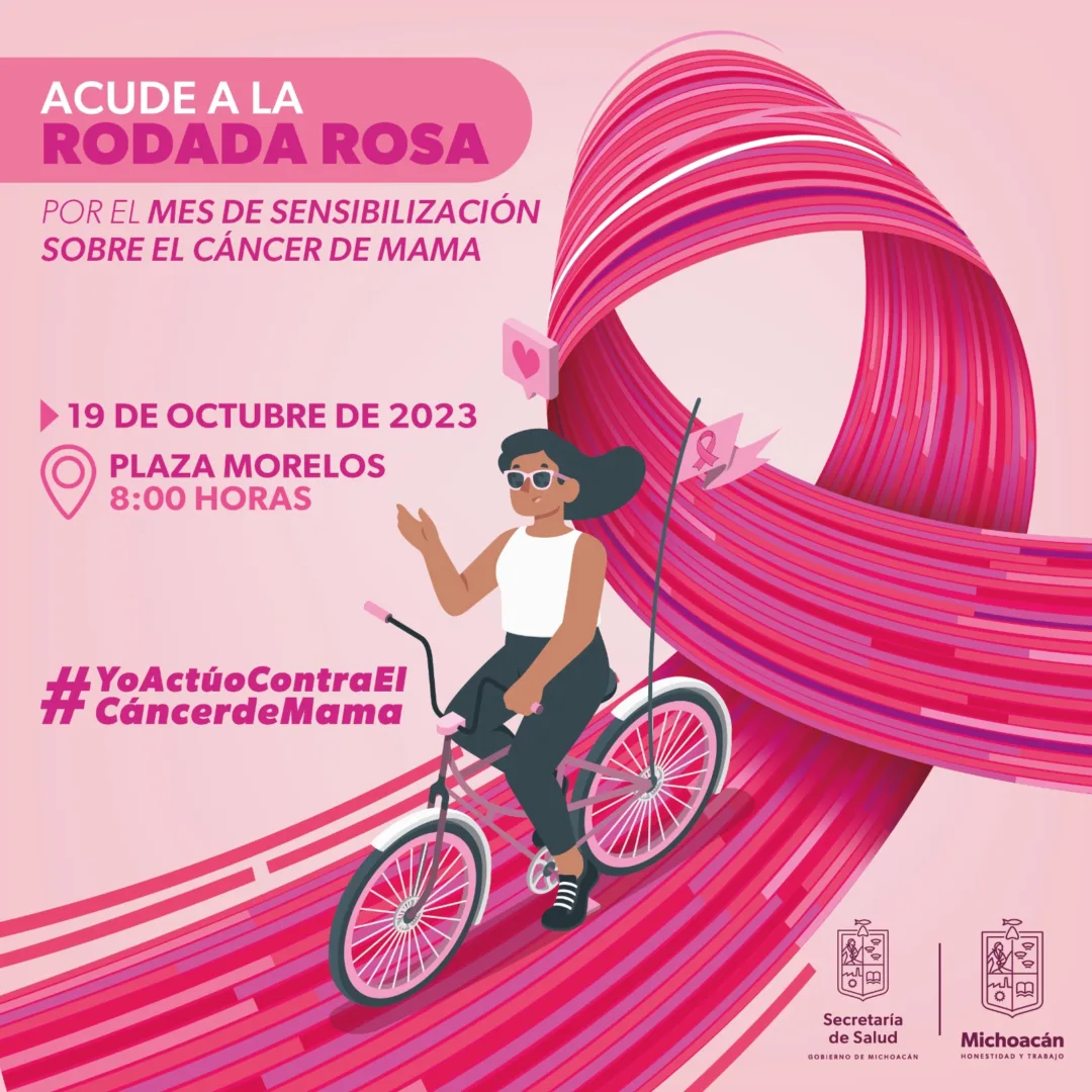 Morelia, Michoacán, 12 de octubre de 2023.- La Secretaría de Salud de Michoacán (SSM) invita a la población a participar en la rodada rosa y la Feria de la Salud de la Mujer, que realizará el próximo jueves 19 de octubre en la plaza jardín Morelos de la capital michoacana, para sensibilizar y promover la detección oportuna del cáncer de mama.