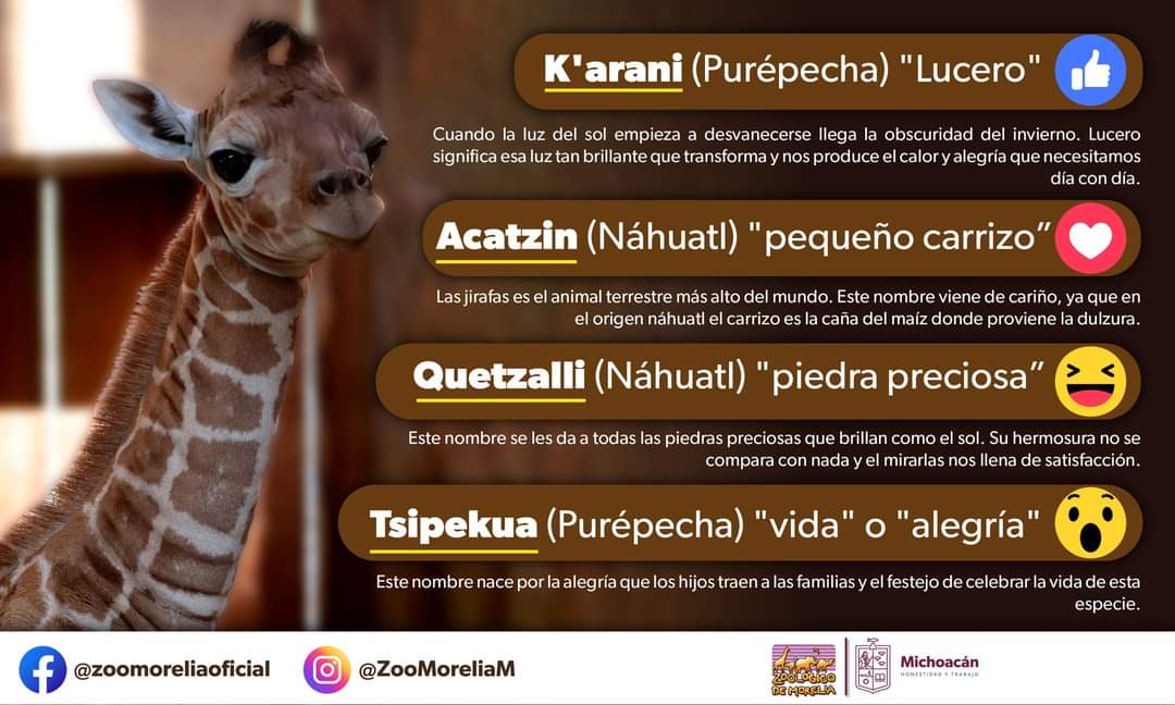 Ganará el nombre que reciba más reacciones. Los nombres son: K’arani (Lucero), Acatzin (pequeño carrizo), Quetzalli (piedra preciosa) y Tsipekua (vida o alegría), los cuales son de origen náhuatl y purépecha.