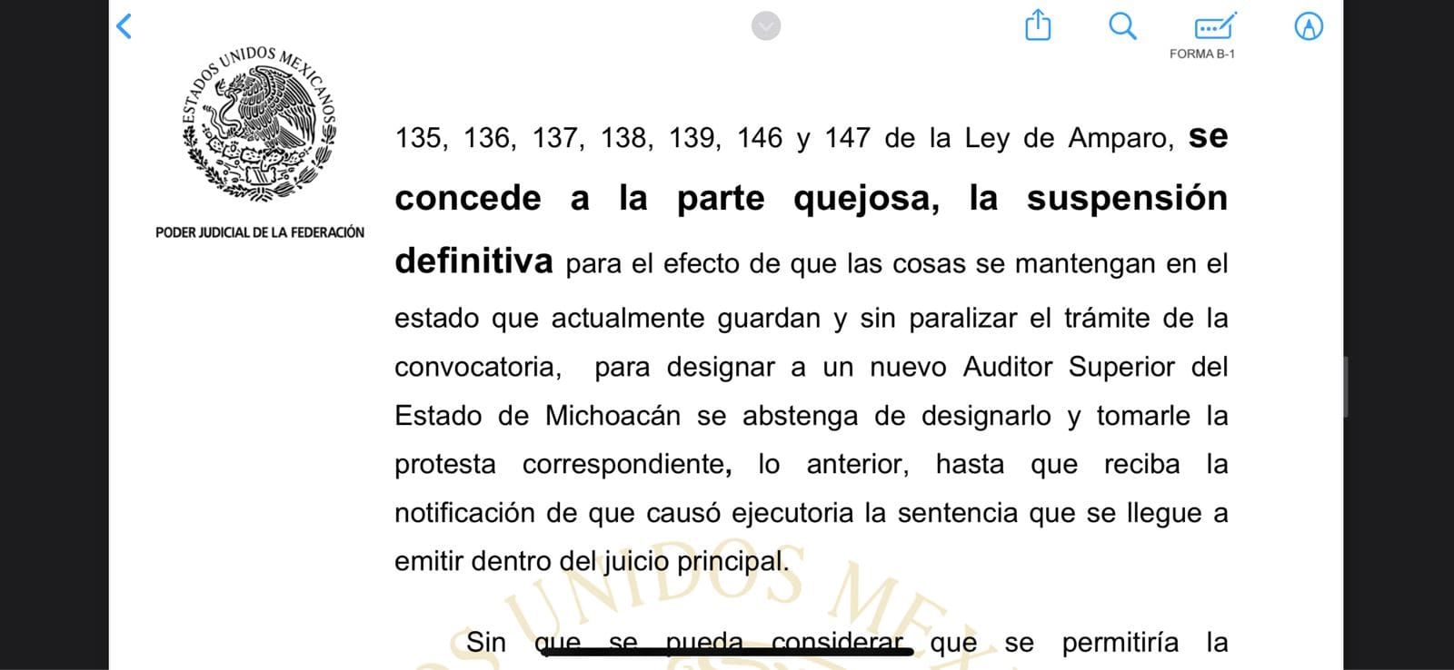Es decir, el recurso promovido por el ex auditor sólo logró prevenir la elección y toma protesta a nuevo auditor en fast track, pero no consiguió que el Poder Judicial lo restituyera en el cargo, ya que el dictamen ratifica que “se concede a la parte quejosa, la suspensión definitiva para el efecto de que las cosas se mantengan en el estado que actualmente guardan y sin paralizar el trámite de la convocatoria”.
