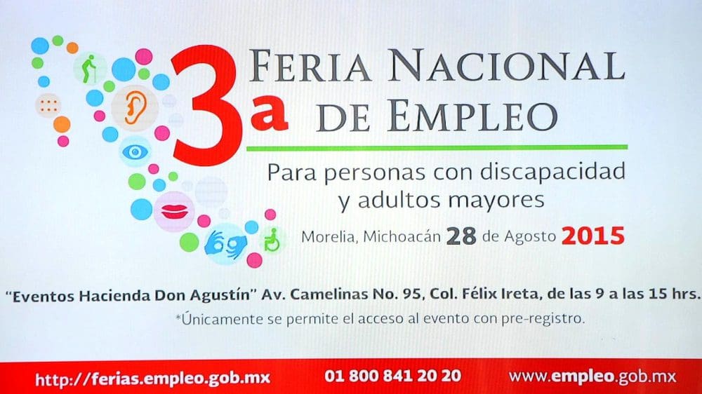 Morelia, Michoacán.- El próximo viernes 28 de agosto, se llevará a cabo la tercera edición de la Feria de Empleo para personas con discapacidad y adultos mayores, en la que se ofertarán 625 vacantes y participarán 18 empresas incluyentes y socialmente responsables.