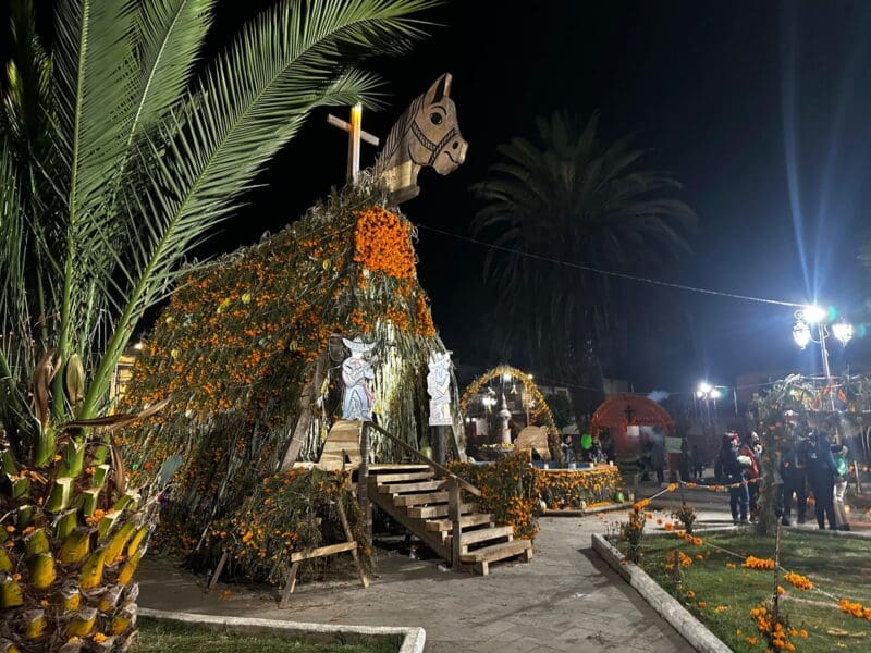 En Cuanajo, otro de los municipios de Pátzcuaro, la tradición de ofrecer “ofrendas montadas” a lomo de caballos de madera se mantiene viva. Las ofrendas son presentadas entre las 21:00 y 22:00 horas del 1 de noviembre, y las casas que han tenido un “difunto reciente” se identifican con arcos de flores de cempasúchil, guiando a las almas hacia su hogar.
