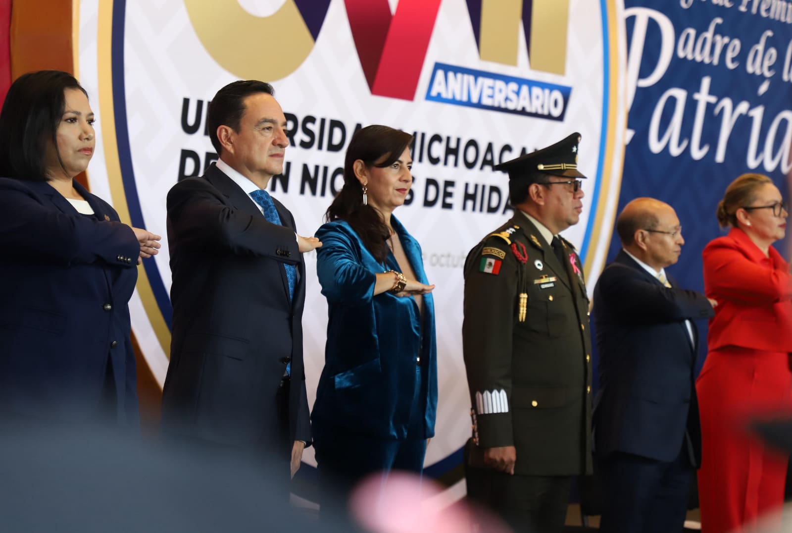 Morelia, Michoacán, 15 de octubre de 2024. – La Universidad Michoacana de San Nicolás de Hidalgo (UMSNH) conmemora 107 años de trayectoria en la formación de destacadas personalidades que han dejado huella en la historia de Michoacán y del país. Durante el evento, la secretaria de Educación, Gaby Molina, resaltó la importancia de la universidad como un pilar fundamental en la educación de generaciones de mexicanos.