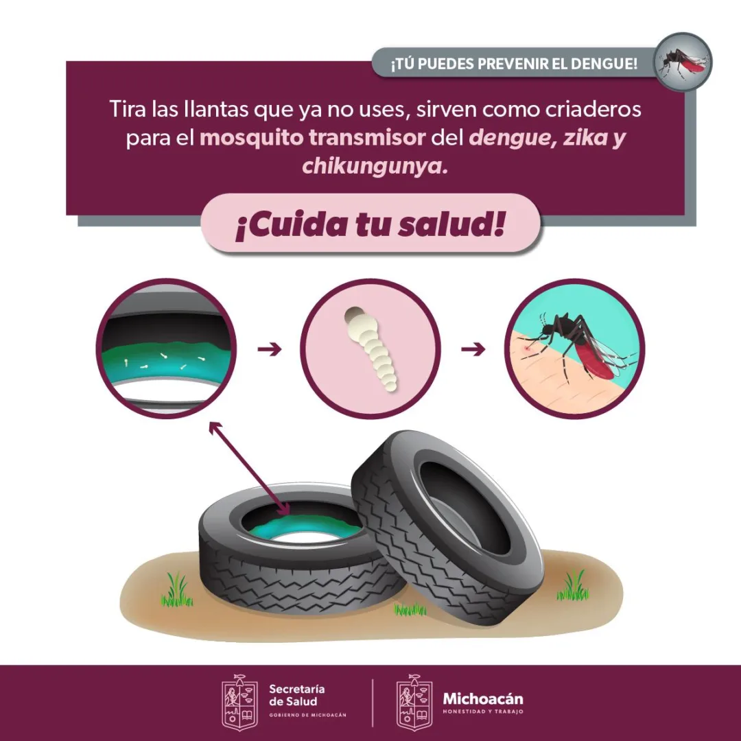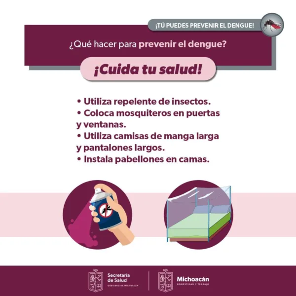 La Secretaría de Salud recuerda que los síntomas del dengue son dolor intenso de cabeza y cuerpo, fiebre mayor a los 38 grados, sarpullido, náuseas y vómito, ante estos signos, es necesario acudir al centro de salud más cercano para recibir atención inmediata y evitar la automedicación.