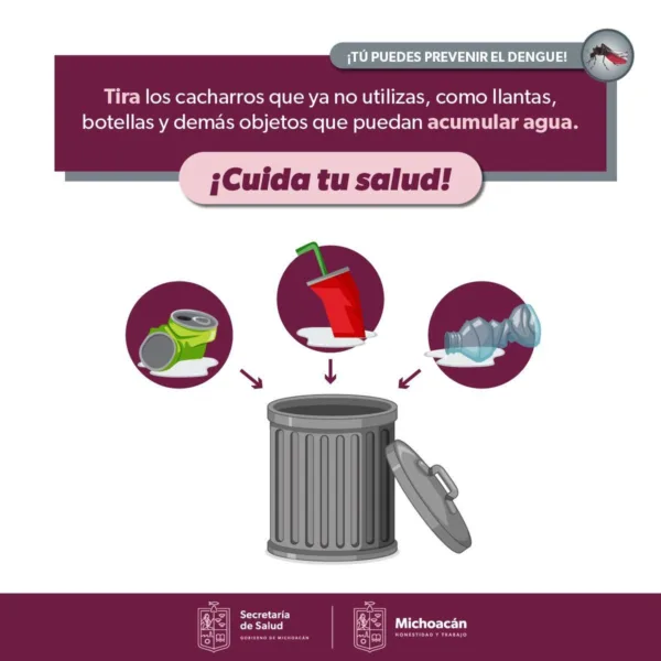 El primer paso es lavar de manera frecuente patios, azoteas o jardines, esto incluye tirar a la basura objetos que ya no se usan y pueden almacenar agua de lluvia como llantas, cubetas, tinas de plástico, macetas o botellas de vidrio, explicó el jefe del Departamento de Control de Enfermedades Transmitidas por Vector y Zoonosis de la SSM, Juan Alejandro Rodríguez Hernández.